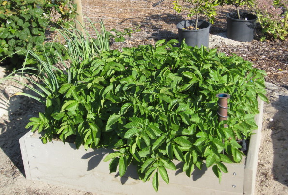 The potatoes look good. Hopefully the measures taken to keep the gopher from getting in with the irrigation pipe will work and there will be lots of new potatoes soon.