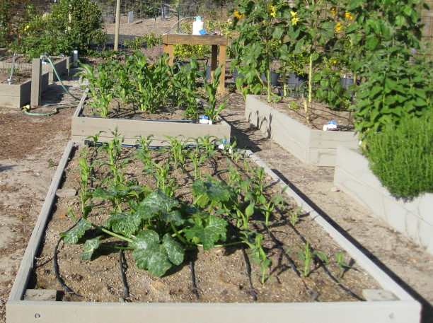 The first planting of corn did not germinate very well. However, that was pretty much expected since the seeds were left over from a couple years ago. The second planting of corn did a lot better along with the zucchini at one end of the bed.