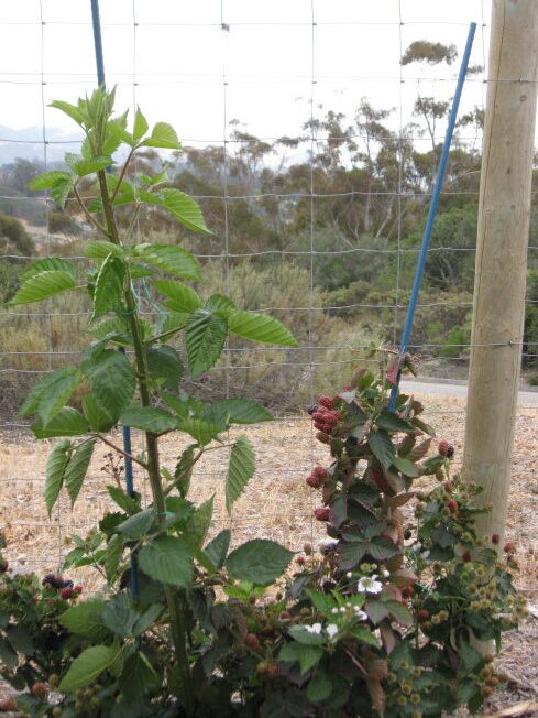 The deer have managed to poke through the fence and do some pruning of the blackberry bushes. And they do not seem to mind the thorns.