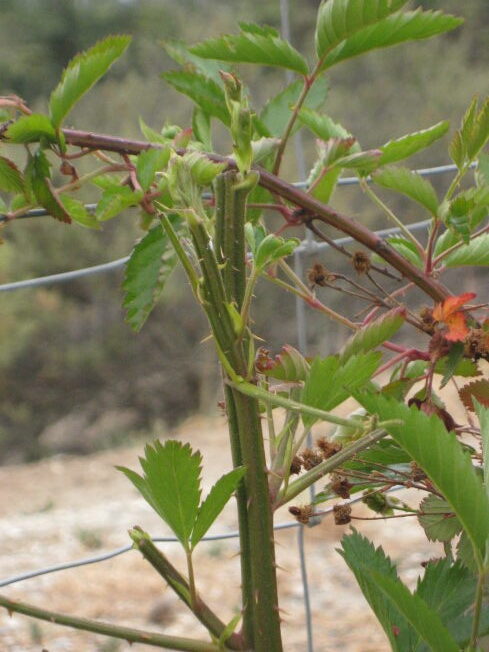 One of the blackberries along the fence. Thick new shoots for the next crop are coming up. They are much more robust than the older branches and full of nasty thorns.