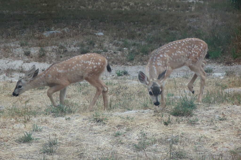 Their baby spots are very pronounced still.  But they are old enough to graze on the weeds on the hill behind our sunroom.  Their mom was nearby as well.