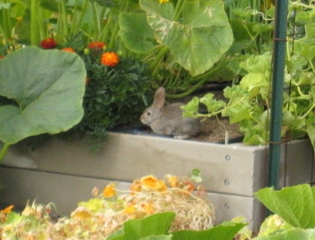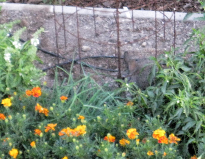 After multiple episodes of finding baby bunny in the garden and chasing him out, we hoped to put an end to it by installing a layer of chicken wire along the lower part of the fencing along the side next to the cottontail habitat. It did not work. We had hoped that they would not go around to the side. For a few days, it looked like a success. But all too soon, the cottontails were hopping around the garden again.