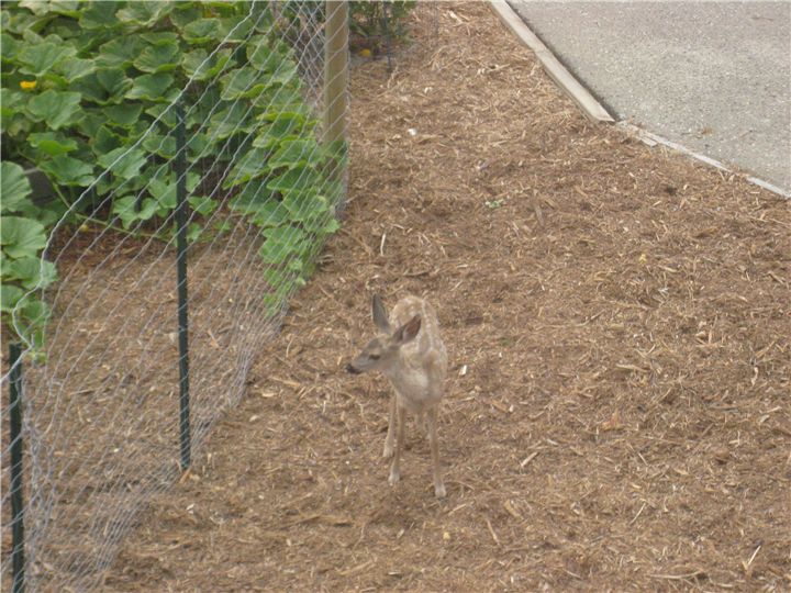 As we finished lunch I glanced at the garden and saw a brown blur on the far side of the fence. When I managed to get a better view, it was the one of the two fawns we had seen visiting before. While the mother was having a buffet lunch over at the dump pile, the little ones were exploring. This one went along the fence line poking its nose through where it could to trim any vegetation within reach. It turned the corner and continued up the driveway to where the fence turned again.