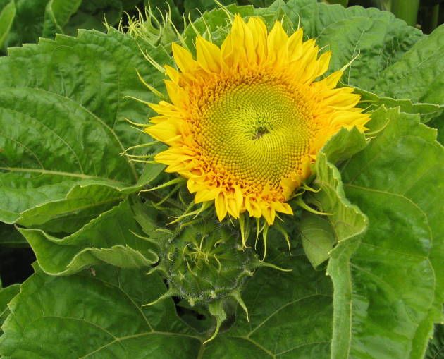 The sunflowers are starting to bloom. The plants are under 3 feet tall but flowers are large.