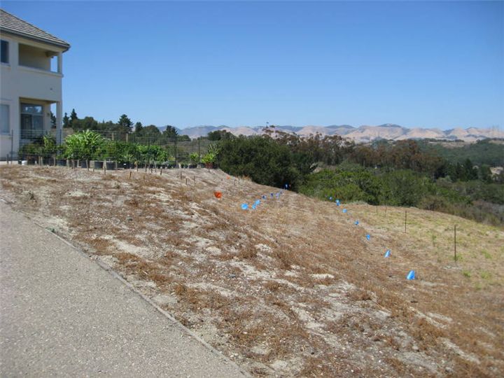 While there were plans on paper, it sometimes turns out that the real situation does not work out as well as paper. So here stakes and flags are being used to test out the plan. The stakes at the bottom of the hill are the proposed fence line, small wood stakes at the top are additional raised bed locations and the flags represent trees or groups of trees.