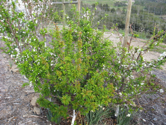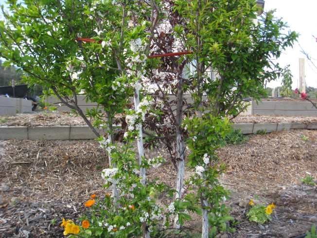 The other way to get four-in-one is planting four pluots closely together. No blooms on this group at all until now.