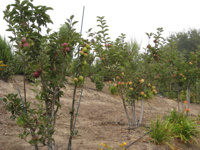 The apple trees as still very young with wimpy trunks and not many branches, but they are producing some a surprising number of apples.