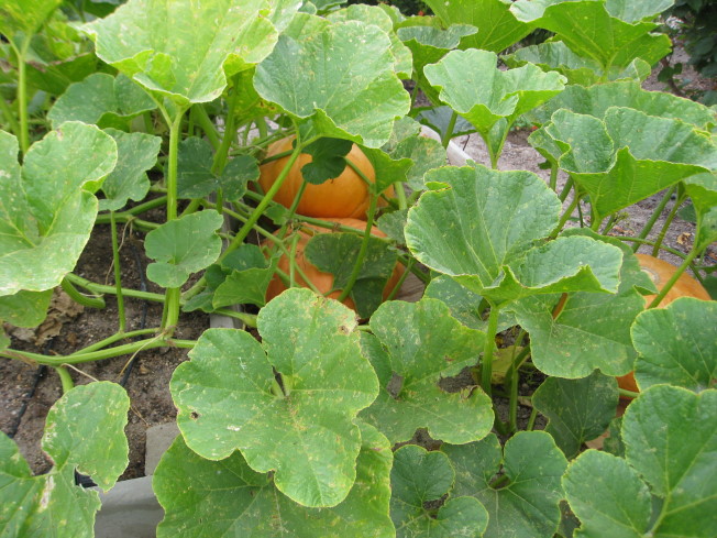 Three Cinderella pumpkins have gotten quite large and will be a challenge to get from the little shelf of ground between the raised bed and the lower level with the fruit trees.