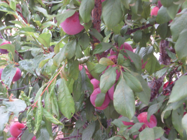 One of the pluot trees, just loaded with ripening fruit. These are of a nice size despite looking like more thinning should have been done.