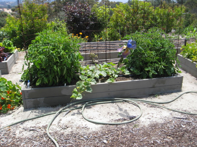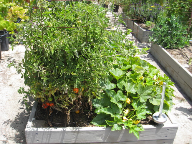 Two of the three tomato plants in the bed are huge while the third one is sickly. In between is a melon which so far, seems happy.