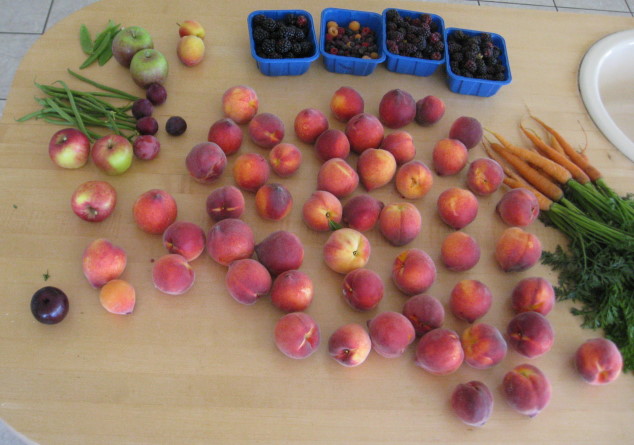 “May Pride” peach section of the multiple peach tree was ready before I realized it. Many were overly ripe and bruised when I pulled them from the tree. There was also a large variety of berries.