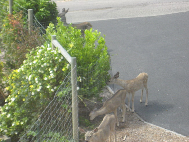 Thee fawns came by and trimmed what they could reach. Their mom stayed on the driveway further from the house. They seem to be regular visitors to our home