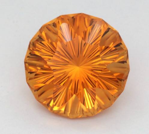 This is a 12.14 carat citrine which is 15.0 mm in diameter. Concave facets were used on both pavilion and crown to maximize the “sunshine”.