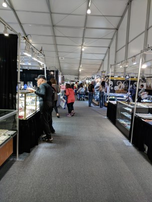 Next stop was JOGS (https://jogsshow.com). Parking was a bit harder to find at this site, but it was a lot easier trip to the show entrance. Based on the description of the show I was hoping to see higher quality goods than at G&LW and hopefully vendors with facet rough. First impression on entering was “where am I”. The floorplan at JOGS deviates from the typical grid used by most shows. It seemed to have more in common with a casino where the object is to keep you from leaving. At some point I found one of the other entrances and located a stack of show guides near the door and used that as a guide to navigating the place. Even then I got turned around several times.